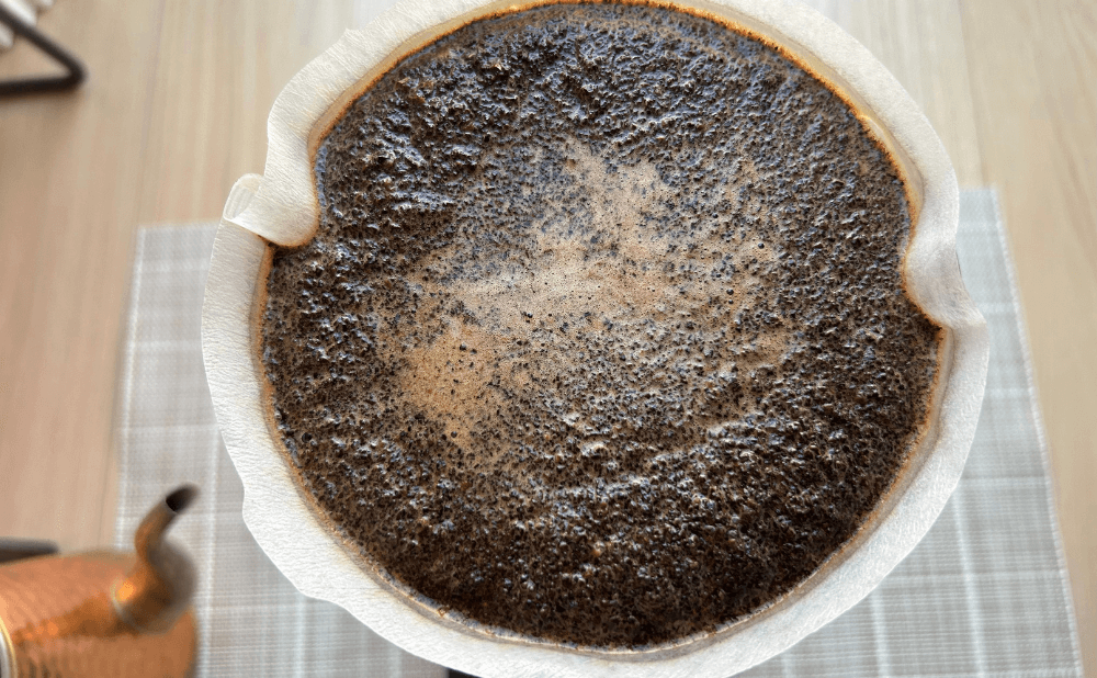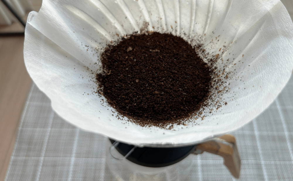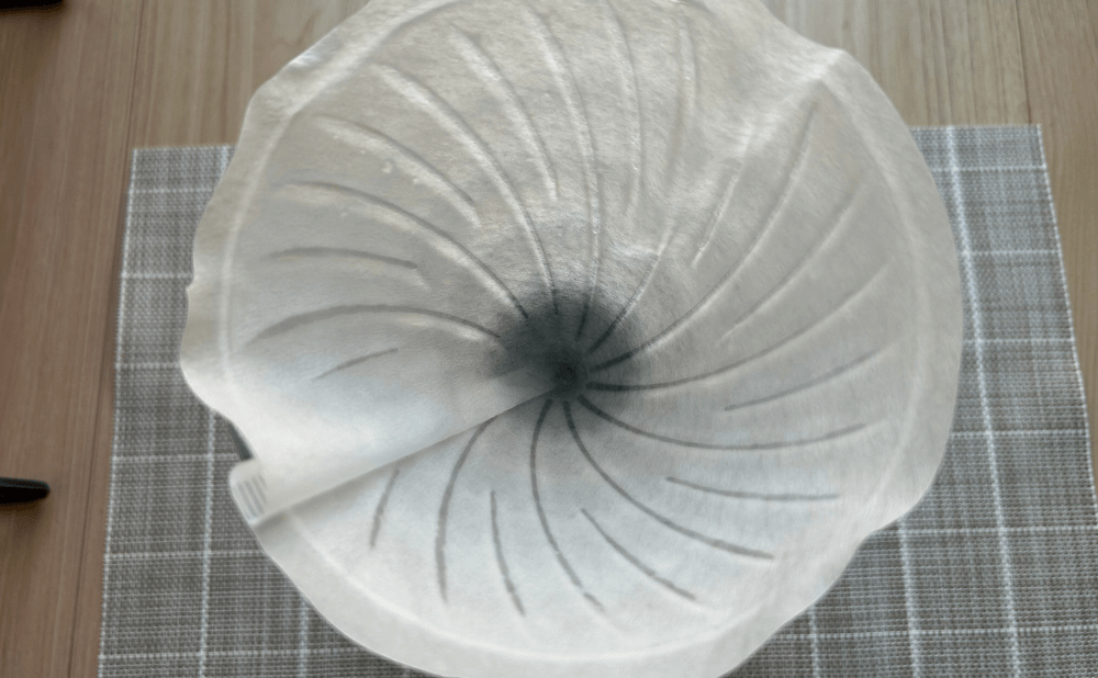 流れ切ったあとのコーヒーの粉はこのような感じです。ペーパーに均一にコーヒーの粉が残っていますね。浸漬式で落とすとこんな感じに残るんですね!