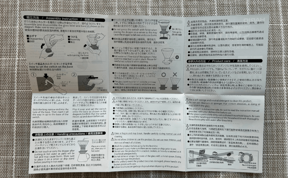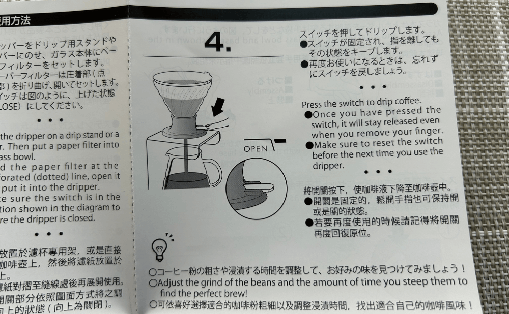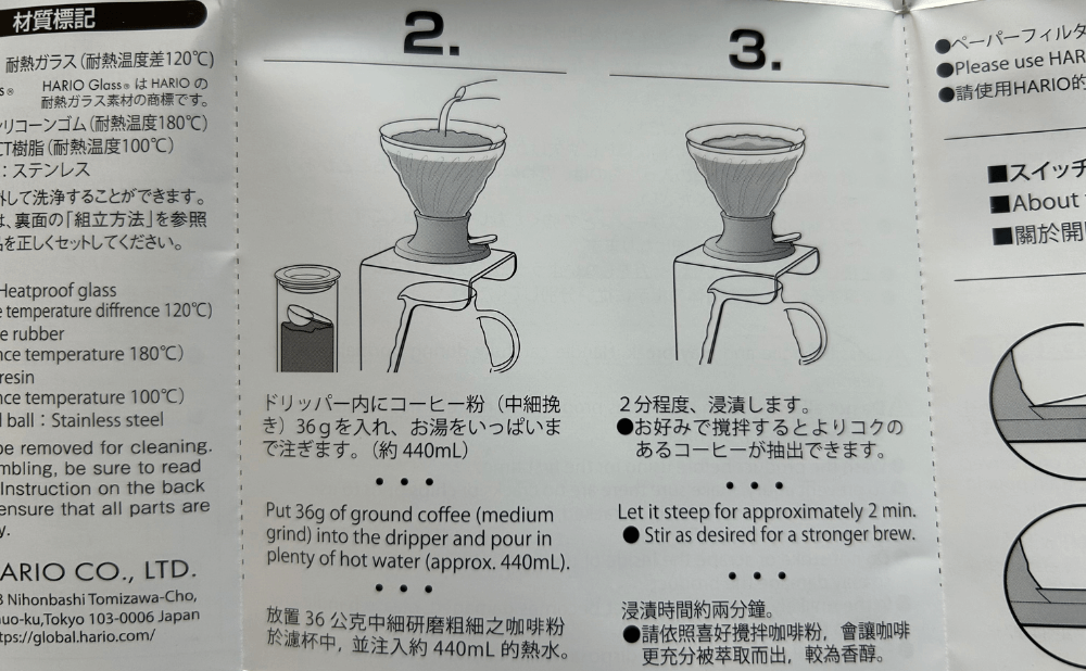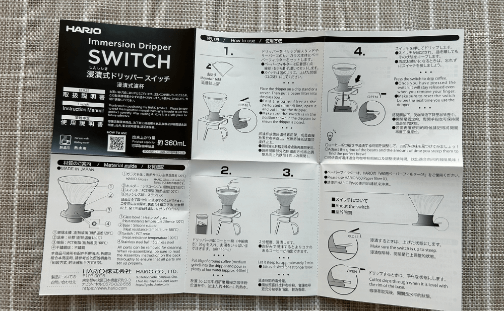 更にどのように淹れるか、スイッチはどうやって使うかなどが書かれた説明書が同封されています。