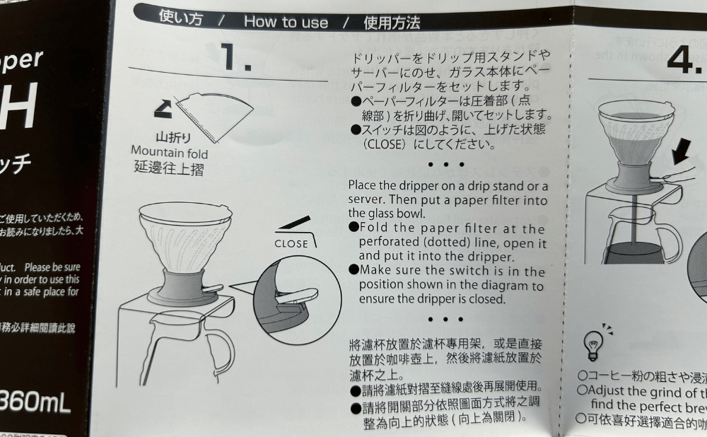 同封されていた説明書に使い方がが書かれていたので見ていきましょう。まずはペーパーフィルターをセットして、スイッチはCLOSE(上にあげる)します。OPENのままだとコーヒーがサーバーに落ちてしまうので注意です。