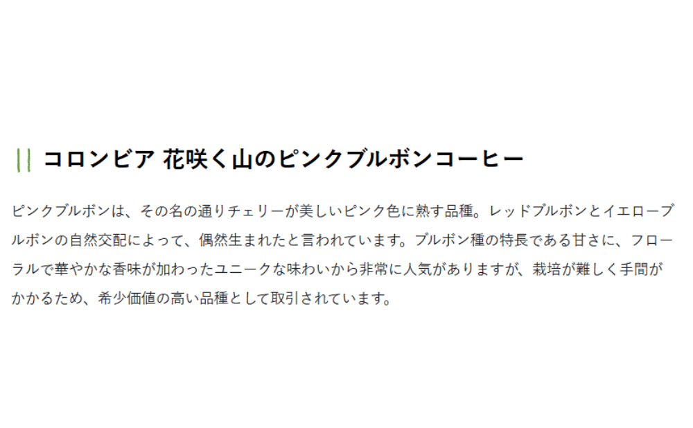 | ピンクブルボン (Pink Bourbon) | ピンク | コロンビア | 希少品種。フローラルで華やか、紅茶のような香りと明るい酸味。スペシャルティ市場で人気。 |