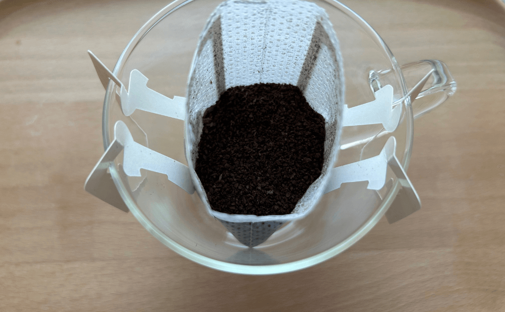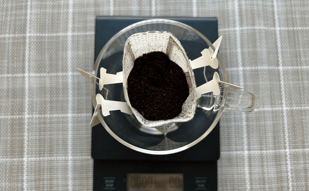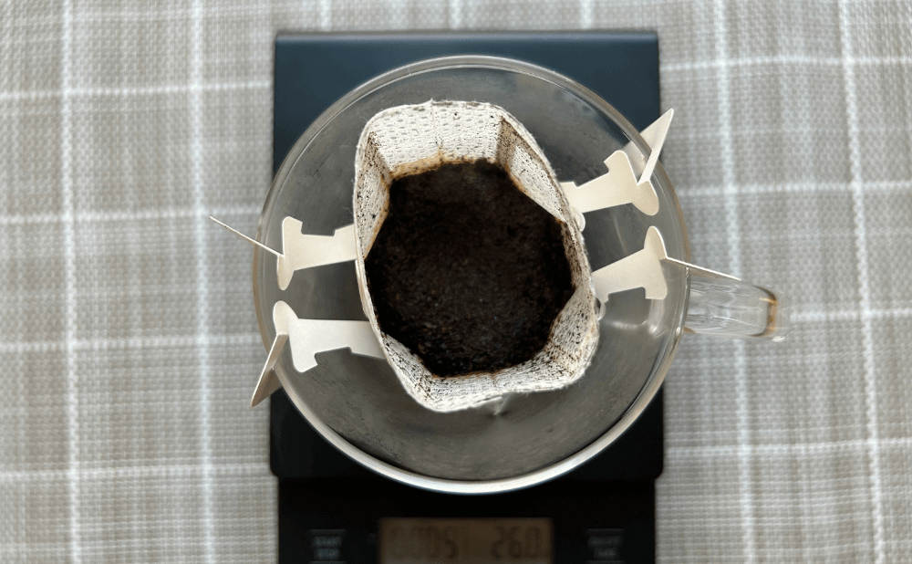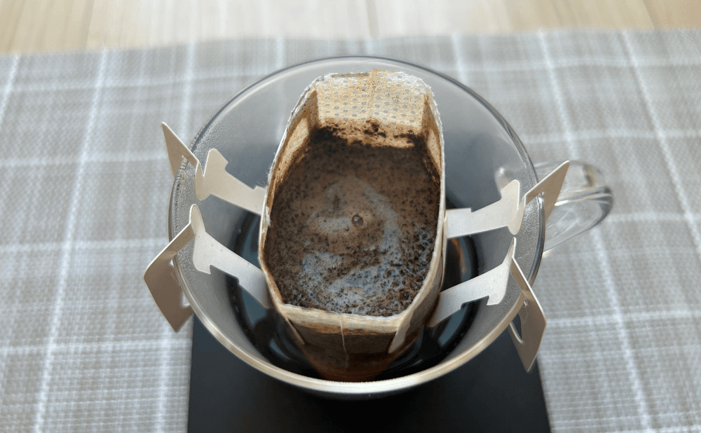 カップに引っかけて少量のお湯を注ぎ、約20秒蒸らした後、2~3回に分けてお湯を注ぎます。