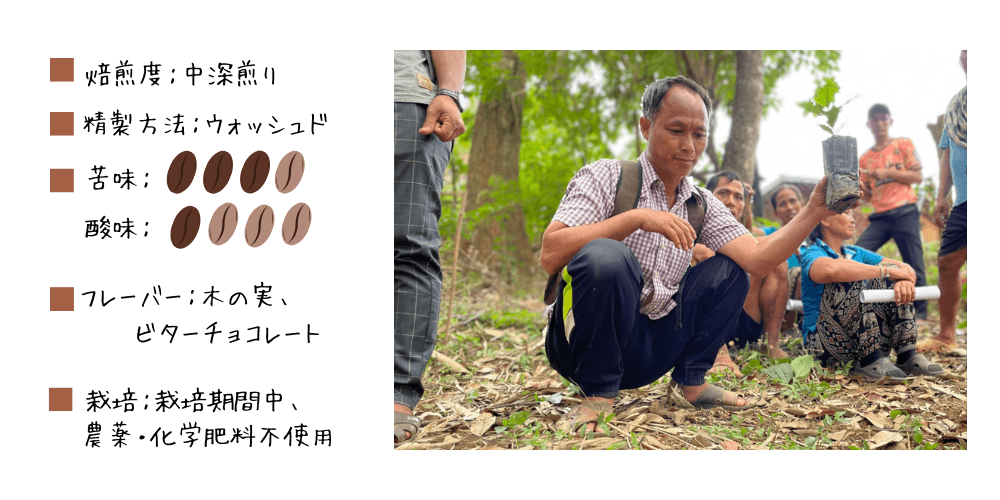 ラオス北部の村で、森を守りながらコーヒーを栽培する取り組みを続けており、昨年からは国連WFPと共に、農家の収入向上と栄養改善のプロジェクトも進めています。今年のコーヒーは、森の実のような優しい甘さが特徴で、ほっとする味わいです。