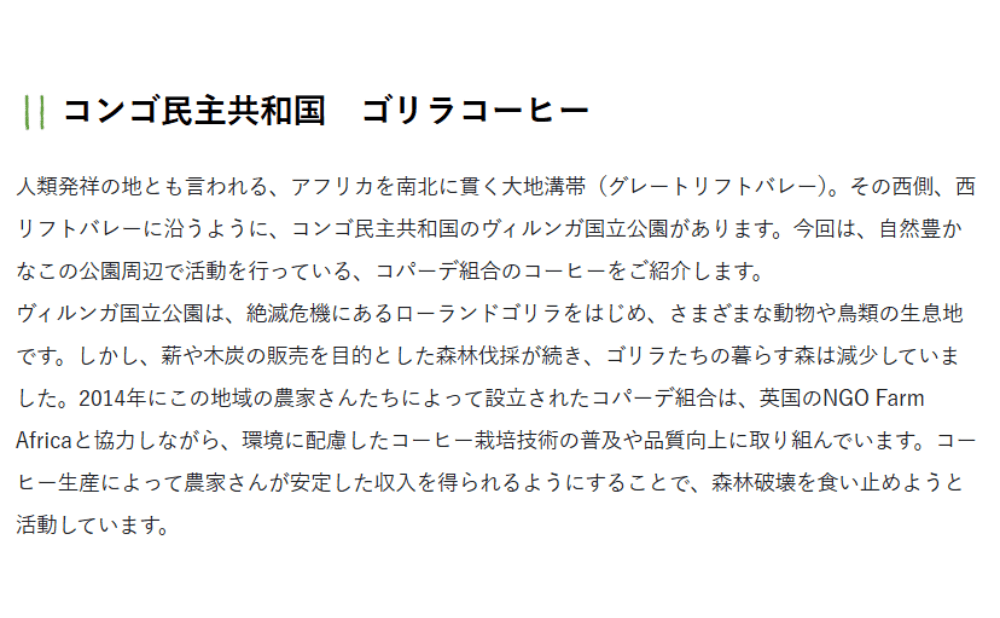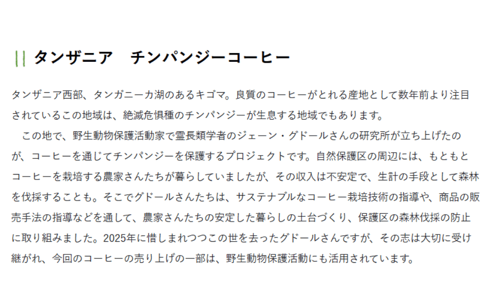 どちらも“霊長類を守るコーヒー”というテーマの通り、野生動物の保護に取り組む生産者さんが育てた豆であり、味わいだけでなく背景にも物語があります。コーヒーを楽しみながら、遠くの森で暮らす仲間たちの未来にも思いを馳せられる、そんな特別なセットでした!ごちそうさまでした!