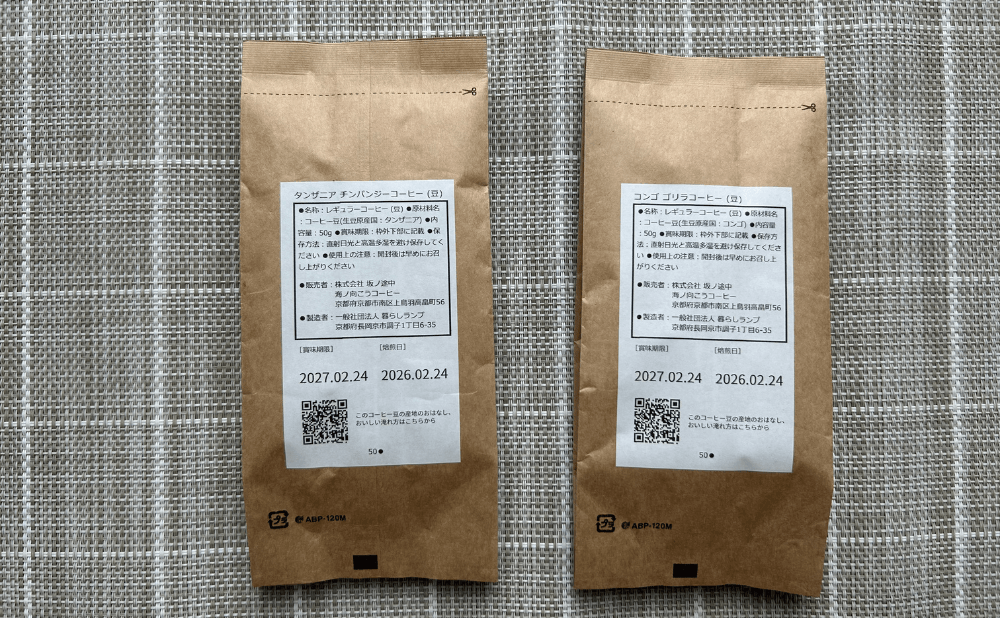今回届いたコーヒーの名前は、ゴリラコーヒーとチンパンジーコーヒーとなっていて、ネーミングがおもしろいですね!
