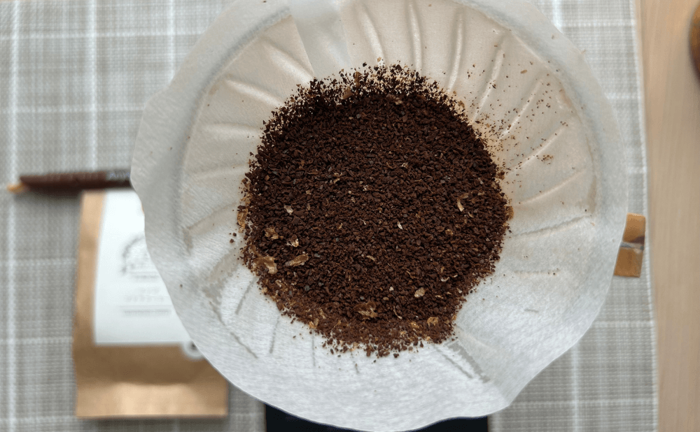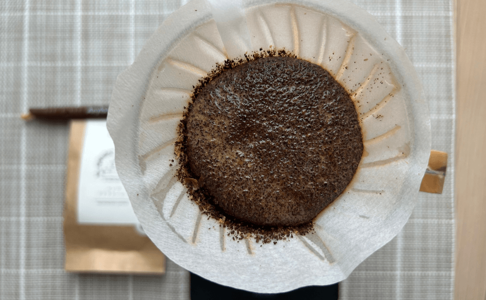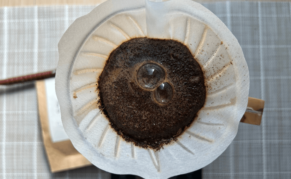 お湯を注いでいきます。第1投目の様子です。中煎りで、深煎りほど膨らみはないです。