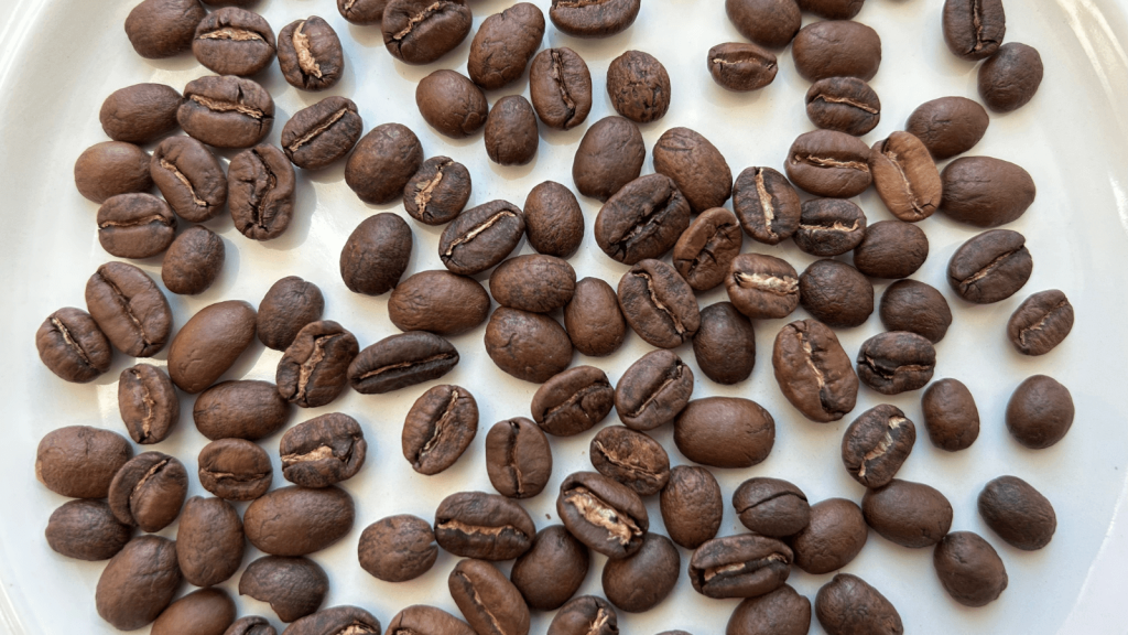 豆の状態です。ブレンドなので大小さまざまな豆がありますね。綺麗な豆が並びます。