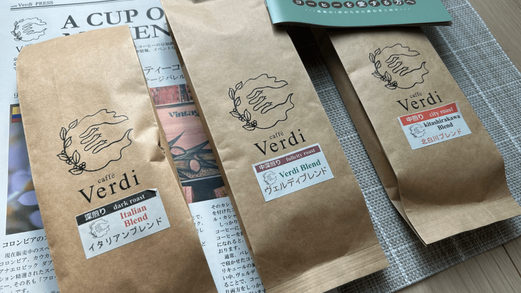 今回は京都にお店を構える自家焙煎珈琲のcafe Verdi(ヴェルディ)のお試しセットを飲んでみたいと思います。京都で3店舗経営されています。焙煎度違いのブレンド3種のお試しセット、楽しみですね!