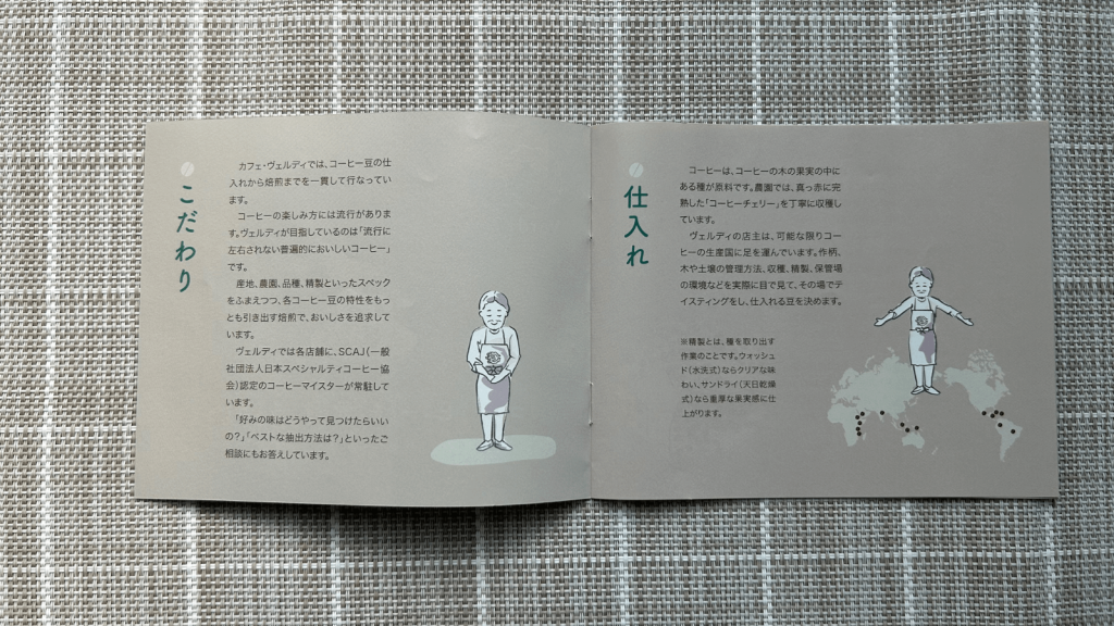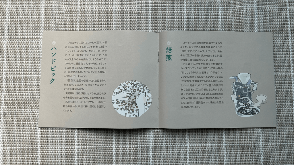 ヴェルディのコーヒーに対するこだわりや仕入れ、ハンドピック、焙煎、抽出と各項目について書かれています。