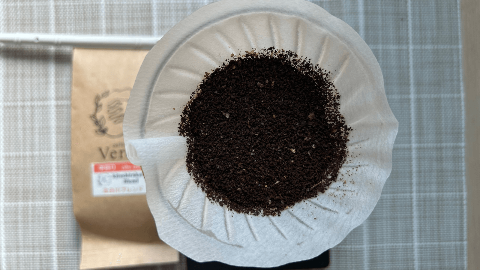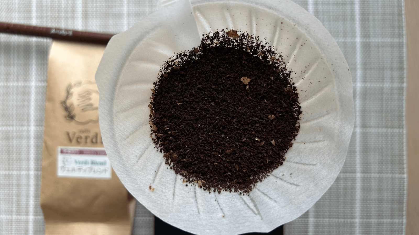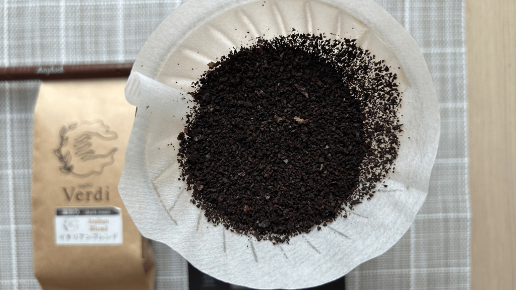 中深煎りの豆です。リンスしたペーパーにのせます。