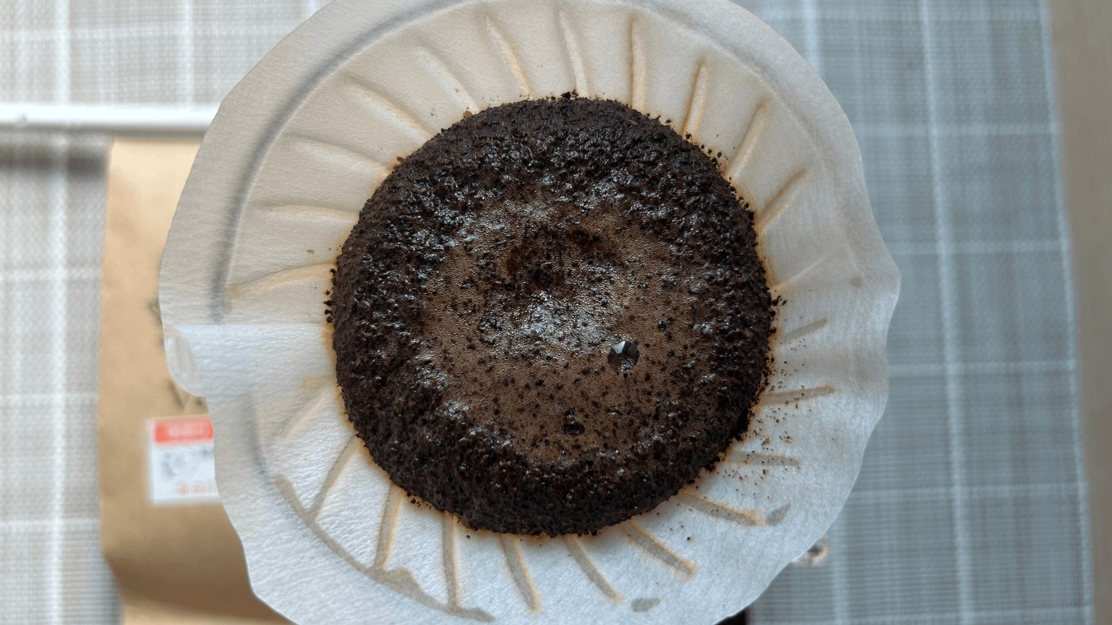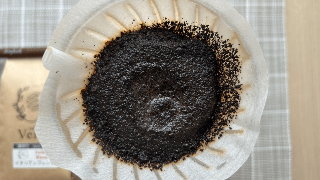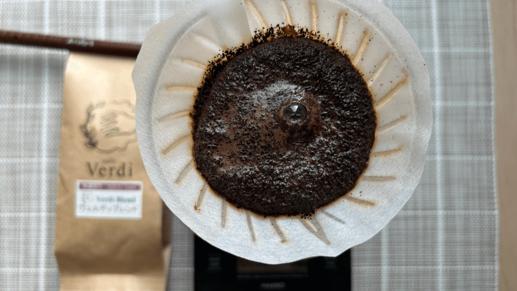 お湯の第一投目です。深さの割には膨らみが弱い気がしました。常に飲み頃のコーヒーをお客様に提供すると書かれているので、焙煎から3~4日のものから香りのピークの1週間後くらいのものが来ると思っているのですが、膨らみがない気がしますね。お湯の温度も問題ないはずなので、焙煎日がいつの豆なのかが気になりました。パッケージには記載がありませんでした。